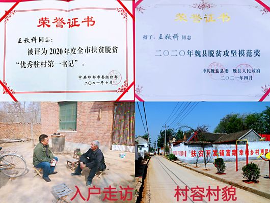 時代是出卷人,人民是閱卷人,他的答卷得到了當地政府和群眾的認可,王秋科被魏縣縣委縣政府授予了“2020年魏縣脫貧攻堅模范獎”,被邯鄲市委組織部授予了“2020年邯鄲市扶貧脫貧優秀駐村第一書記”。